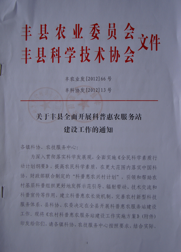 為完善農村新型科技服務體系,豐縣科協、農委結合豐縣實際,以豐農業發[2012]66號、豐科協發[2012]13號文,印發了《關于豐縣全面開展科普惠農服務站工作的通知》。