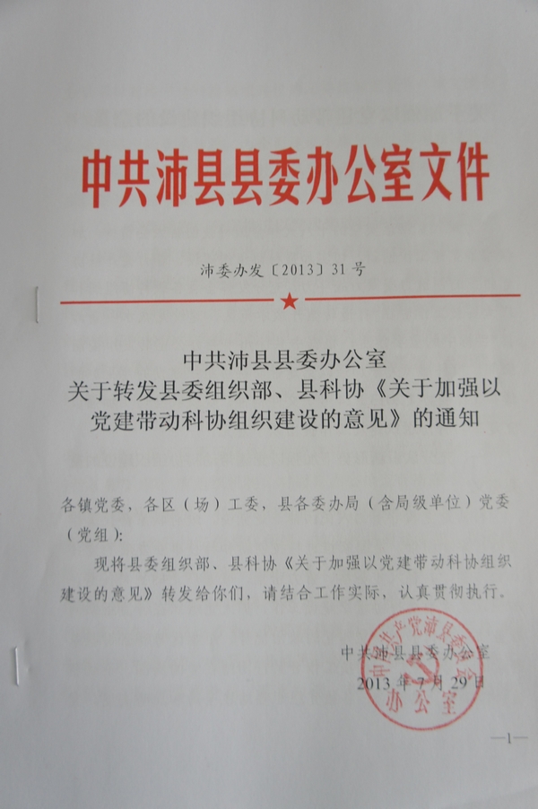 為充分加強科協組織建設,著力加強科協黨組的創造力、凝聚力、戰斗力,讓各部門堅定地支持科協組織履行職能,為科協組織建設創造良好的發展環境。充分發揮沛縣各級科協組織和廣大科技工作者在“打造轉型升級示范區,建設龍城水鄉新沛縣”目標中的重要作用。沛縣縣委辦公室于7月29日下發通知,轉發了縣委組織部、縣科協《關于加強以黨建帶動科協組織建設的意見》(沛委辦發【2013】31號)。